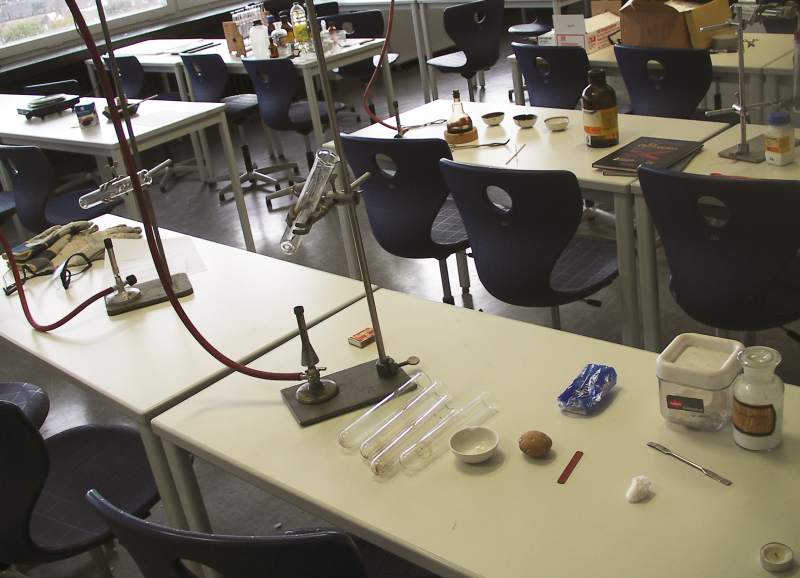 Reagenzglasständer, 2 Bunsenbrenner, 2 Schutzbrillen. 1 Paar feuerfeste
