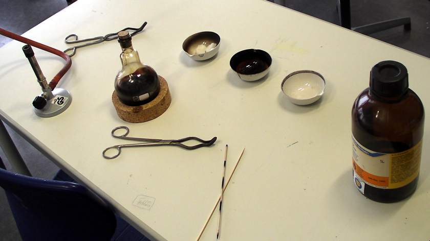 Zu zweit immer zwei Sachen zugleich auf zwei Bunsenbrennern erhitzen: