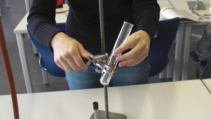 Sicherheitsmaßnahme), der andere tunkt das Reagenzglas ins kalte Wasser.